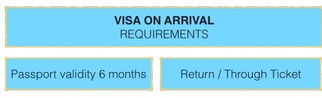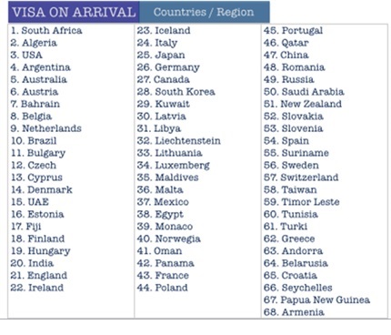 VISA ON ARRIVAL (VOA), with Visa Index # B213, are given to nationals of 68 countries which can be obtained at designated entry airports and sea ports.
